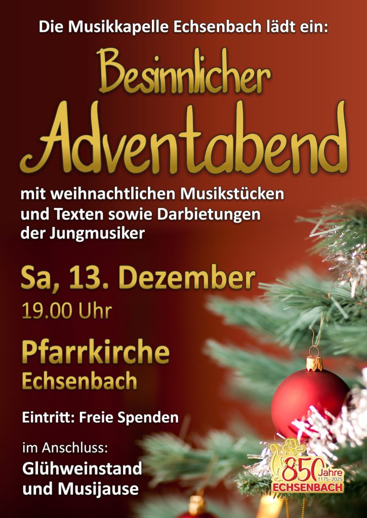 Am Samstag, dem 13. Dezember 2025, luden wir zum jährlichen besinnlichen Adventabend in die Pfarrkirche Echsenbach ein. Zahlreiche Besucher:innen folgten der Einladung und genossen einen Abend voller weihnachtlicher Klänge und besinnlicher Texte.